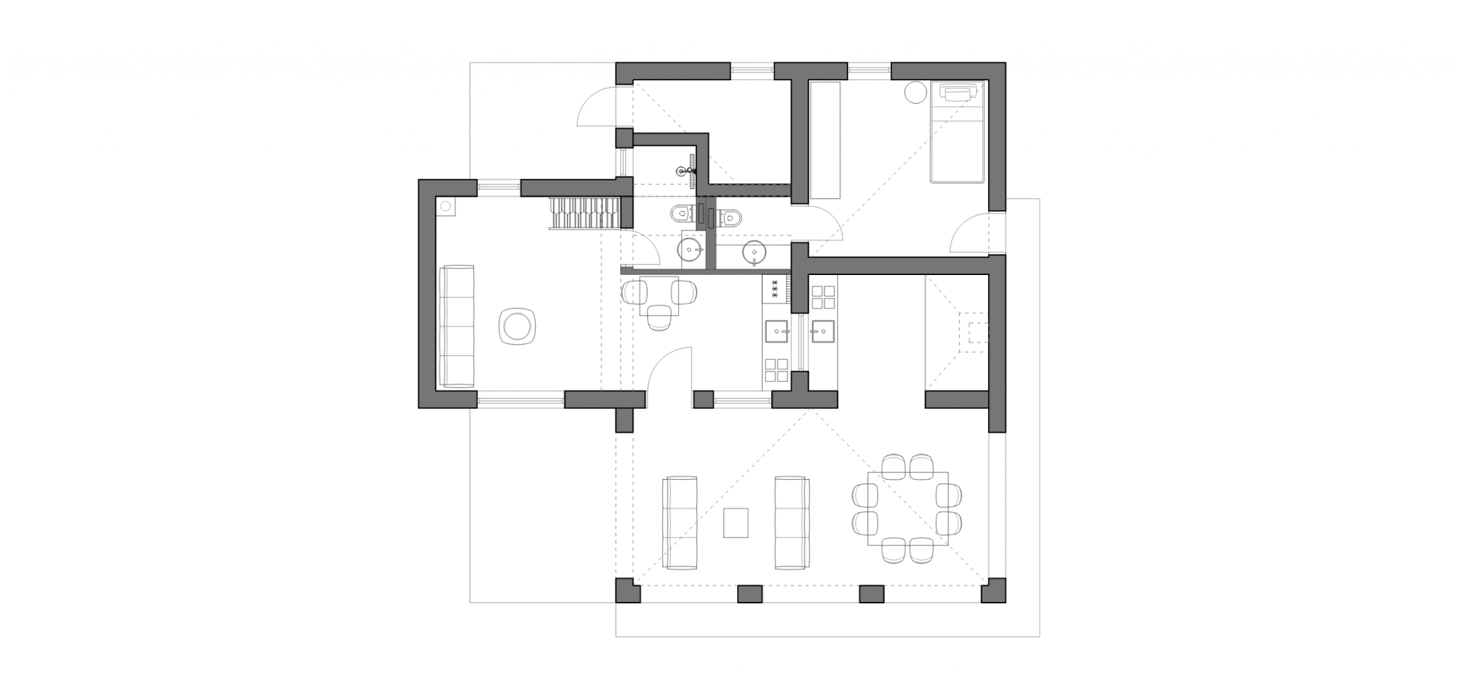 Referring to the design logic of traditional Dalmatian houses, two overlapping volumes were created, each of which accommodates its type of space. The volume of the primary content is designed as an elementary house with a gabled roof with tiles and rough plaster. The volume of the secondary content is lined with stone and covered with a hipped roof.