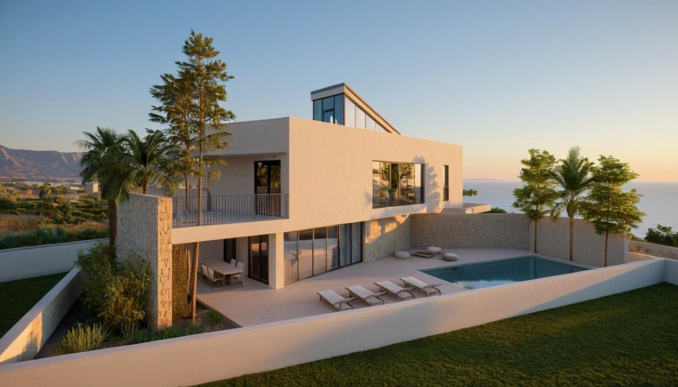 Prizemlje je spojeno s kamenim zidovima na terenu i otvara se prema jugu — dnevne funkcije klize u pejzaž, a boravak se produžuje na natkrivenu lođu i prostor oko bazena.