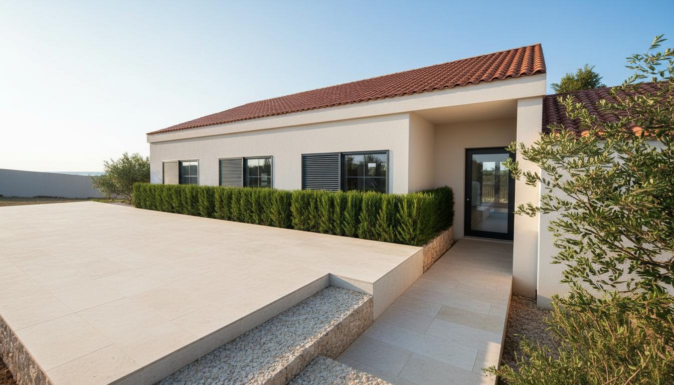 Materijali su birani s ciljem trajnosti, neutralnosti i uklapanja u okoliš: svijetla žbukana fasada, kameni potporni zidovi i tamna metalna pergola stvaraju uravnotežen kontrast između težine i lakoće, tradicije i suvremenosti. Zelenilo je integrirano u arhitekturu kroz podignute gredice, penjačice i mediteransko bilje, čime kuća tijekom vremena dodatno „sraste“ s terenom.
