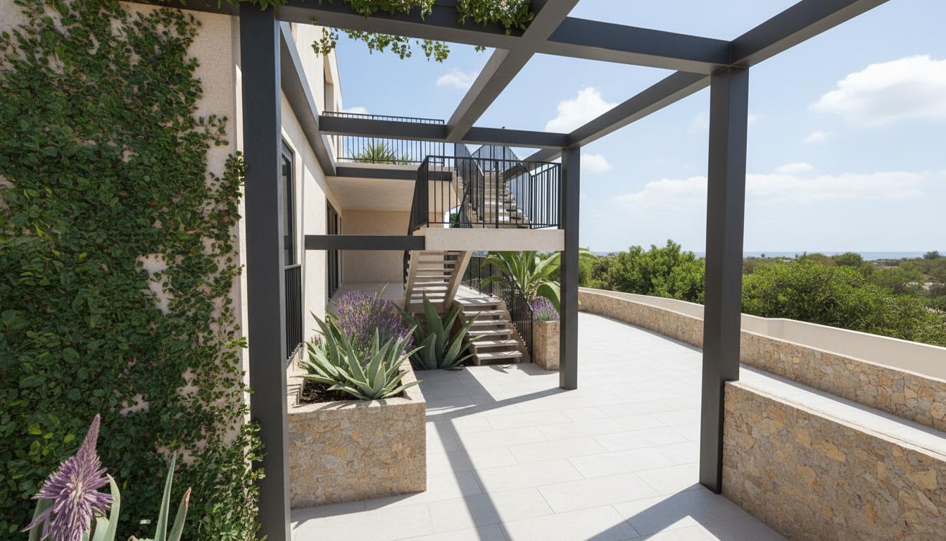 Pergola uvlači vrt u sebe, dok se terasa postupno dematerijalizira, lomi po visini i stapa s vanjskim stubištem koje vodi na krovnu terasu, s pogledom prema moru.